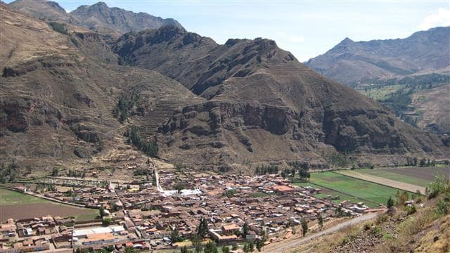 A few days later, Arturo takes Karla and Andreas on a tour through the Valle Sagrado, the sacred valley of the Incas. The mountain above the town of Pisas is called Condor Mountain by some. They claim that it has the shape of a condor. At the top are the head and beak and the agricultural terraces on the left and right form the wings. It’s a little difficult to see in the rather small photo. But, again, a little chicha might help.