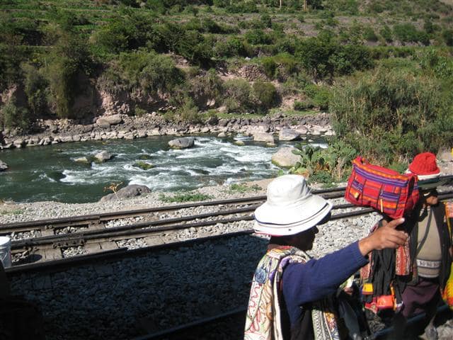 Karla and Andreas take an overnight trip to Machu Picchu, the ancient Inca citadel. The peasants offer their ware to the tourists on the train passing by.
