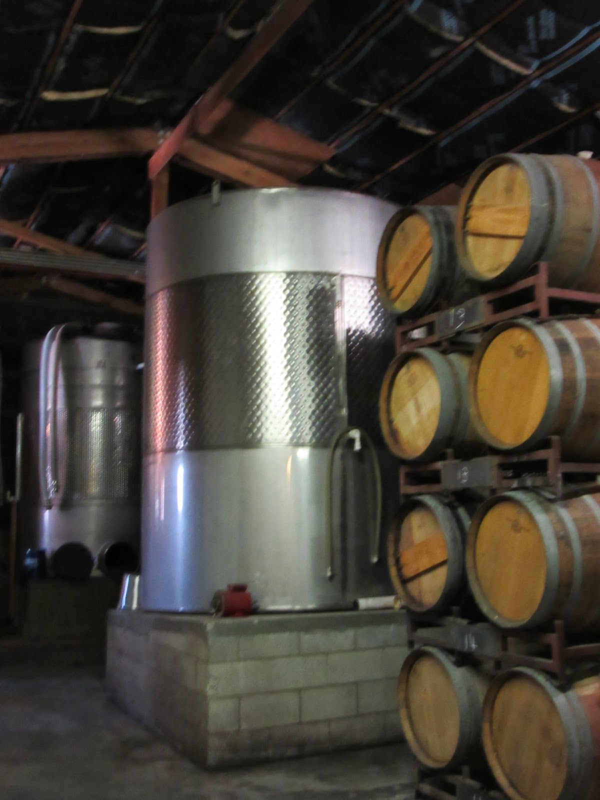 There was a small sign on the barn that said “Tasting,” so I opened the door, went inside, and stood smack in the winery itself: fermentation tanks on one side, stacks of barrels four levels high in the middle and the back, and boxes of bottled wine on the other side.