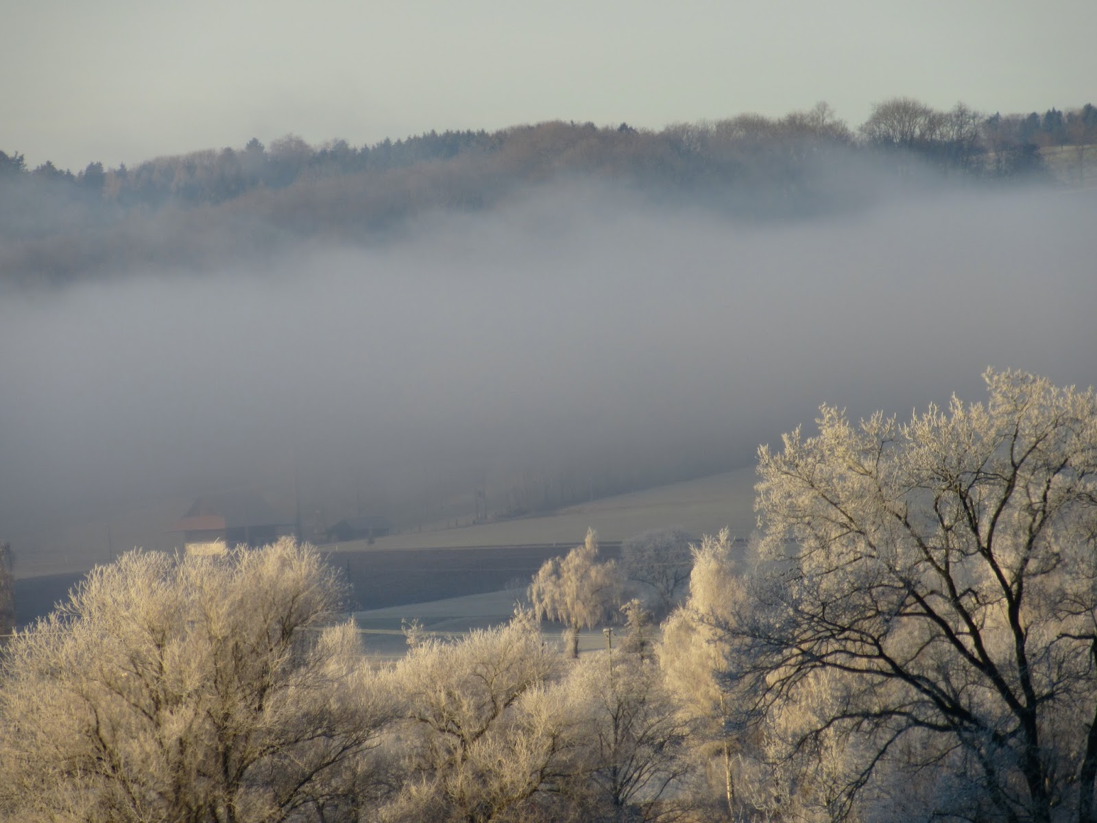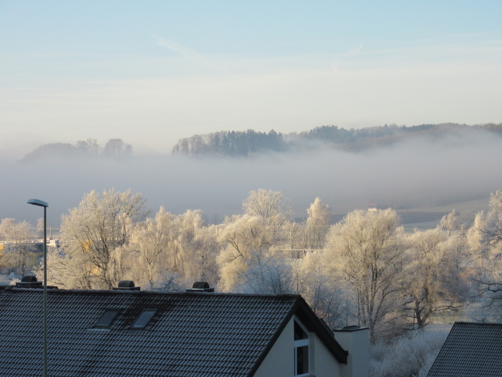Day 1: This is a picture of my home town in Switzerland with hoarfrost and the fog snaking its way through the landscape. I thought of it because I woke up this morning in California to a foggy day.